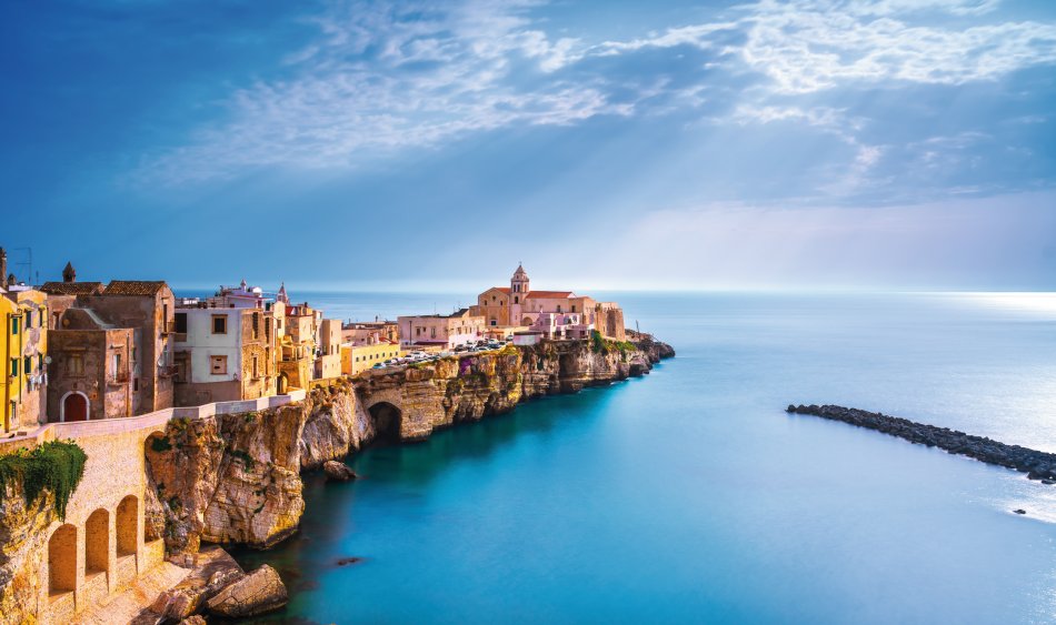 Nach dem Frühstück fahren wir durch die herrliche Gegend des Adriatischen Mittelmeeres. Auf der rechten Seite können Sie die Ausläufer der Abruzzen sehen und zur linken begleitet uns immer das azurblaue Meer. Im Laufe des Nachmittags erreichen wir das Gargano-Gebiet. Diese Region Apulien-Gargano gehört zu den schönsten in ganz Italien. Sie werden fasziniert sein vom kristallklaren Meer und seinen wirklich sehenswerten Buchten und einer traumhaften Landschaft. Vieste, auch Königin von Gargano genannt, wird unser Übernachtungsort sein. Vom 4*Hotel Degli Aranci aus, sind Sie in wenigen Gehminuten in der malerischen Altstadt mit den vielen Geschäften, Restaurants und Bars. Auch den Strand erreichen Sie in wenigen Schritten.