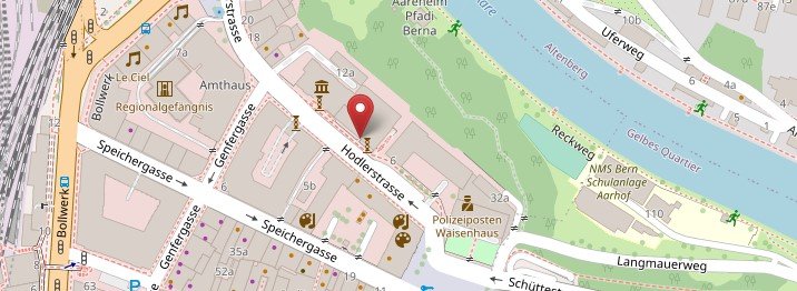 Unsere Carreisen ab Bern beginnen in der Hodlerstrasse direkt vor dem Kunstmuseum in der Hodlerstrasse. Mit öffentlichen Verkehrsmitteln ab Bern erreichen Sie den Zustiegsort in wenigen Minuten. Es gibt 3 Buslinien Nr. 20,21 und 11 mit denen fahren Sie eine Station bis Bollwerk, von dort sind es ein paar Minuten zu Fuss. Parkiermöglichkeiten für das Auto gibt es bei Metro Parking.